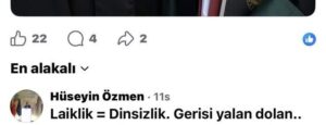 Sosyal medya platformlarında paylaşılan ekran görüntülerine göre, Hüseyin Özmen’in “Laiklik = Dinsizlik. Gerisi yalan dolan..” şeklindeki yorumu, kısa sürede tepki çekti. Söz konusu ifadenin kamu görevlisi kimliği taşıyan bir kişi tarafından dile getirilmesi, tartışmayı daha da büyüttü.